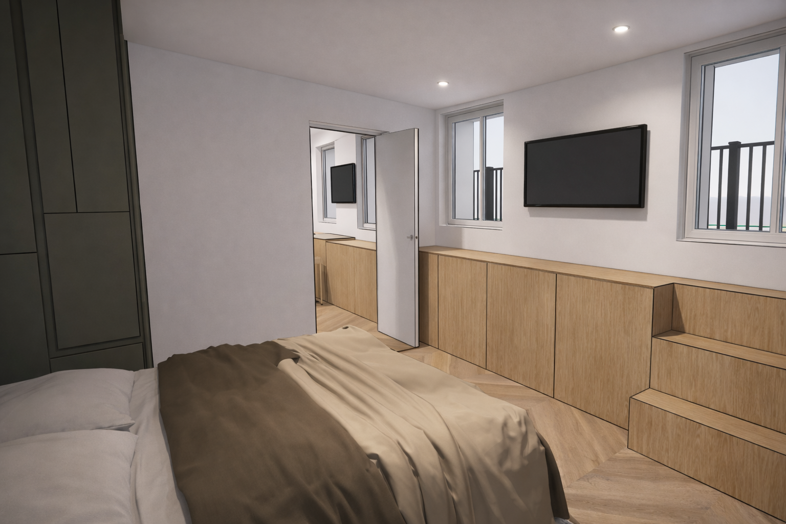 La conception s’est appuyée sur une palette de teintes douces et naturelles : beige, pierre et bois clair. Ces couleurs créent une atmosphère chaleureuse et élégante, tout en laissant la lumière naturelle dialoguer avec les matériaux.