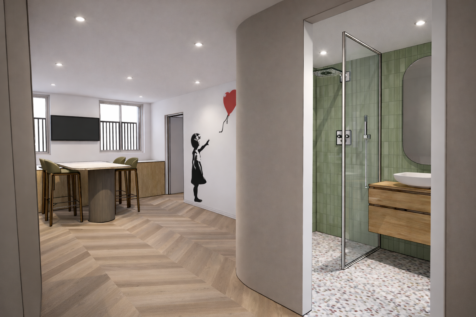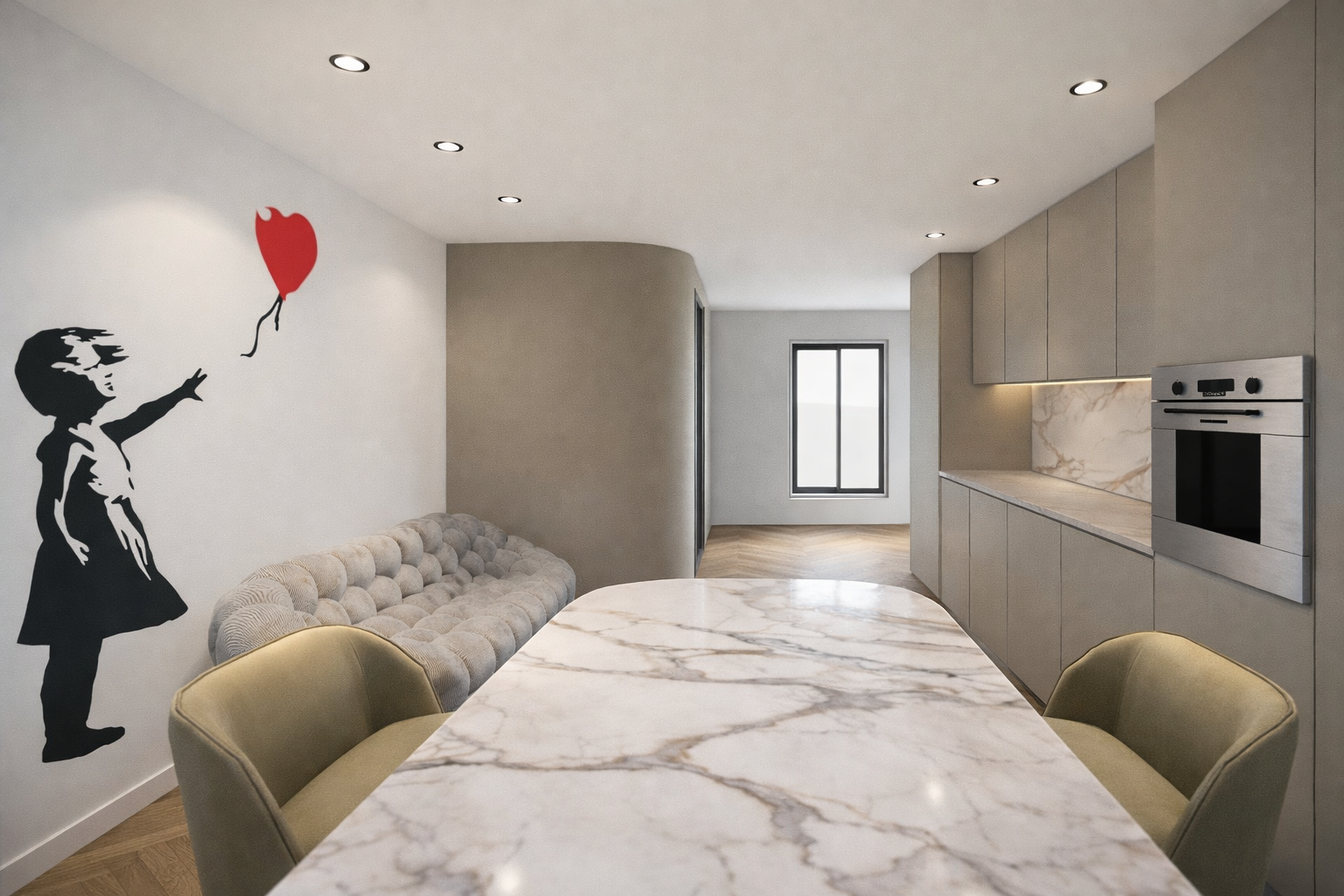 Pour apporter une touche artistique et un peu d’impertinence dans cet univers très maîtrisé, un clin d’œil à Banksy vient animer le mur principal. La célèbre silhouette à la balloon girl crée un contraste subtil entre art urbain et élégance intérieure.