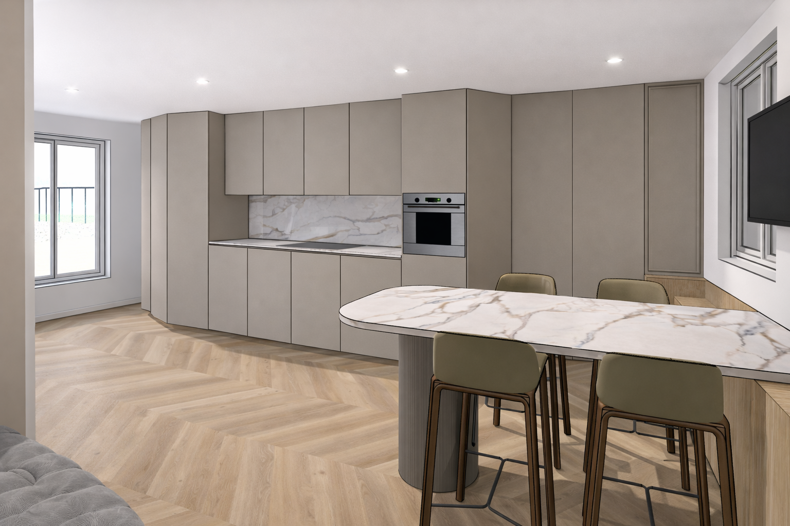 La cuisine, épurée et contemporaine, s’intègre parfaitement dans l’espace de vie grâce à des lignes minimalistes et des matériaux nobles comme le marbre et les façades mates. L’ensemble forme un volume cohérent et apaisant, où chaque élément trouve sa place.